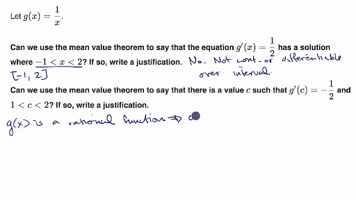There is at least one value c in 1 2. It states that if f x is defined and continuous on the interval a b and differentiable on a b then there is at least one number c in the interval a b that is a. 2 3 1 3 2 fx x 13 x 13 27 8 3 2 3 2 2 1 3 3 3 3 x x x Therefore c 827 which is indeed within the interval 0 1.